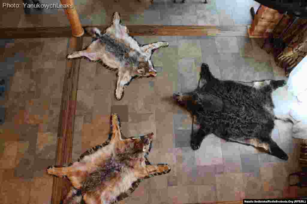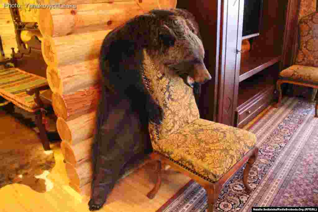 Всередині будинку відвідувачів зустрічає опудало голови кабана, трохи далі на тумбочці – сова, на стіні навпроти – голова лося. На підлозі в головній залі розпластані шкіри вовків, з крісла звисає шкіра ведмедя. На другому поверсі цього будинку – декілька гостьових кімнат. «Члени клубу практично тут не зупинялися. Бувало, затримувалися до 2-3 ночі – і все», - говорить Сергій, який раніше працював на будівництві об’єкту, але який відмовився назвати своє призвіще.