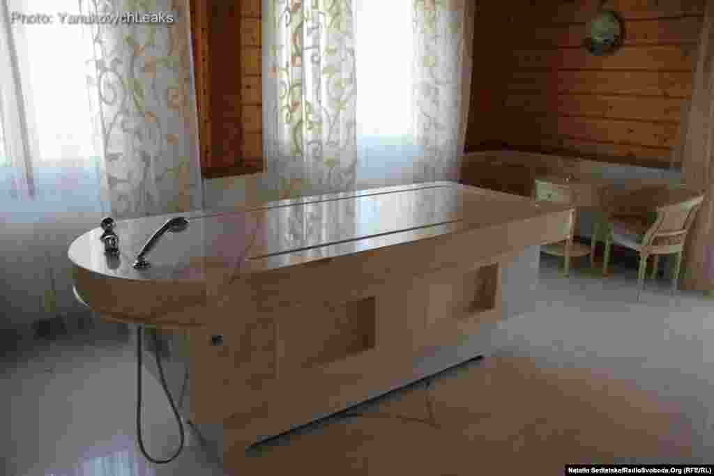 Сергій, який брав участь в будівництві всіх об’єктів в Сухолуччі, запевняє, що будівництво об’єкту «Острів» почалося з лазні, яку Януковичу подарував Олександр Ярославський. «Вона за спецзамовленням робилася в Петербурзі, потім її привезли сюди і зібрали», - стверджує він. Ярославський не відповів на питання для цієї статті.