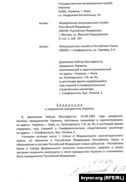 «Джемилев Хайсер в установленный законом Российской Федерации время подал заявление в миграционную службу Симферополя и Москвы, в котором указал, что желает сохранить гражданство Украины и отказывается быть признанным гражданином Российской Федерации. В заявлении он указал, что проживает и зарегистрирован по адресу в городе Киеве», – отметил адвокат.