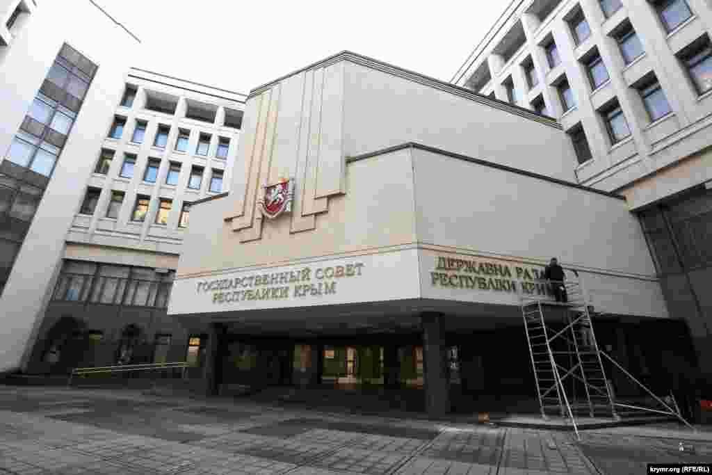 Работники фирмы подрядчика в течении пяти часов крепили буквы «ДЕРЖАВНА РАДА РЕСПУБЛІКИ КРИМ» на фасаде здания «Госсовета». Если завтра будет хорошая погода, обещали прикрепить на крымскотатарском языке. А после заменят буквы в русскоязычном варианте надписи на новые, пообещал сотрудник фирмы.