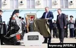Затем мероприятия сместились к зданию Совета министров, где состоялась церемония открытия закладного камня на месте возведения будущего памятника «Народному ополчению всех времен». Этот памятник должен увековечить, как выразились руководители Республики, исторические события «Крымской весны». Митрополит Симферопольский и Крымский УПЦ Лазарь провел молебен и освятил памятный камень «самообороне».