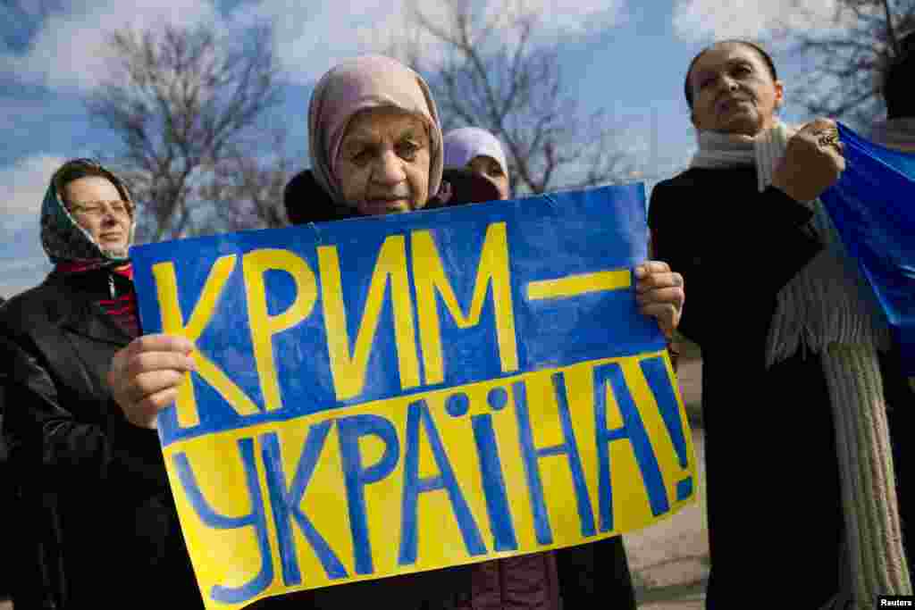 Женщины крымскотатарской общины выкрикивают лозунги во время проукраинской демонстрации возле села Ильинка 14 марта 2014 года