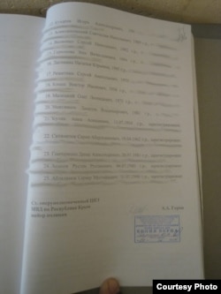 Фото списка попало в редакцию Крым.Реалии. В списке также значится имя Александра Костенко, который в ходе громкого дела в Крыму за «избиение» «беркутовца» на Майдане по представлению российского прокурора Поклонской уже осужден к 4 годам и 2 месяцам тюрьмы.