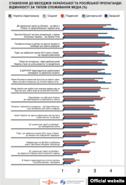 Исследователи выделили несколько месседжей российской пропаганды, в частности, что Майдан организовали американцы, а к власти пришли националисты, Крым удалось спасти, а Донбасс восстал, и теперь «хунта борется со своим народом». Таким образом удалось вычислить индекс – от нуля до ста, где сто – когда люди поддерживают все тезисы, и ноль – когда ни одного, рассказал генеральный директор КМИС Владимир Паниотто.