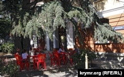 Столики кафе в тени огромного ливанского кедра – ну как не полюбить Ялту с первого взгляда!