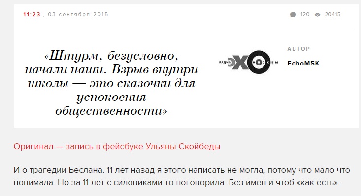 Журналист Заур Фарниев был в Беслане 11 лет назад. 3 сентября, в годовщину трагедии, он написал блог, в котором отреагировал на запись известной журналистки "Комсомольской правды" Ульяны Скойбеды (теперь удаленной и из "Фейсбука" и с сайта "Эха Москвы", где она была перепечатана), в которой утверждалось, среди прочего, что штурм "безусловно, начали наши", а "взрыв внутри школы – это сказочки для успокоения общественности".