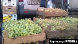 Но это все не производители, а перекупщики. Их можно отличить по широкому ассортименту овощей и фруктов и обжитым торговым точкам. Эта фотография сделана здесь же, на «Привозе», но две недели назад. Сейчас виноград подорожал, в розницу 120-150 рублей килограмм (34-43 гривны).