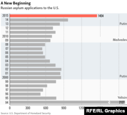 Количество новых ходатайств о предоставлении убежища в США россиянами достигло своего наивысшего уровня за более чем два десятилетия. Российские граждане подали 1454 новых ходатайств о предоставлении убежища в 2015 финансовом году, который завершился 30 сентября. Это означает 50-пооцентный прирост по сравнению с предыдущим годом и рост более чем в два раза по сравнению с 2012 годом, когда президент России Владимир Путин вернулся в Кремль после четырехлетнего пребывания на посту премьер-министра. Такие данные Радіо Свобода получило от Министерства внутренней безопасности США на основе закона США о свободе информации.