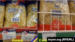 Некоторые пояснения: фотографии прилавков с продуктами и ценами расположены рядом, слева – супермаркет в Киеве, справа – в Симферополе. Чтобы не было ошибок, фотографии подписаны и помечены цветами флагов Украины и Крыма.