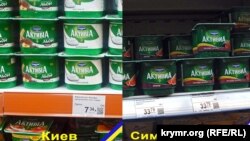 Фотографии прилавков с продуктами и ценами расположены рядом, слева – супермаркет в Киеве, справа – в Симферополе. Чтобы не было ошибок, фотографии подписаны и помечены цветами флагов Украины и Крыма.