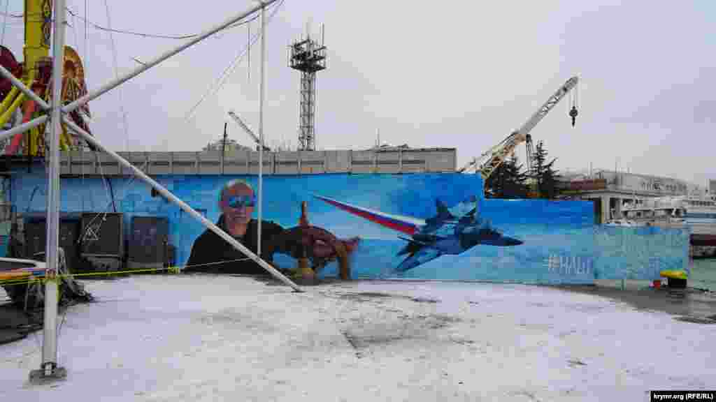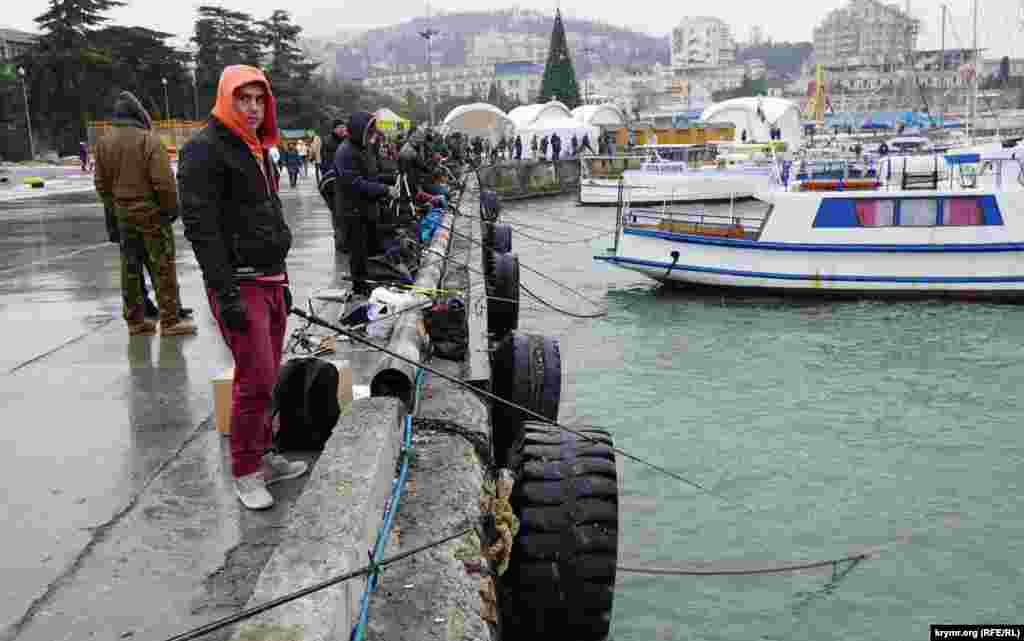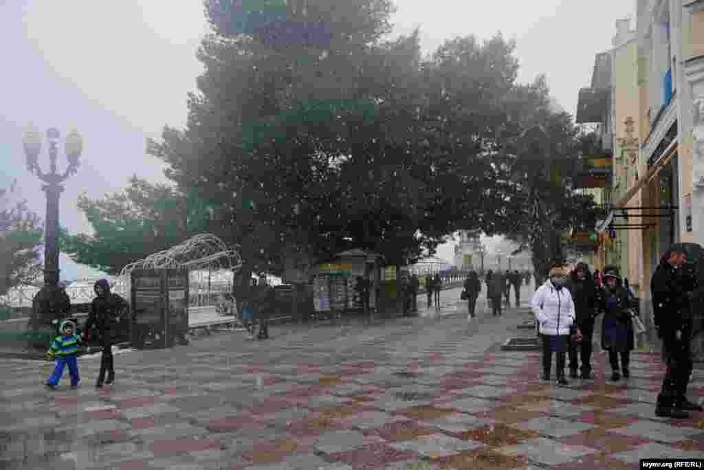 Сами приготовления к Рождеству в Ялте были заметны только близ центральной набережной, где традиционно и проходят все торжества. Несмотря на обильный мокрый снегопад при температуре +3, рабочие возле главной новогодней собирали деревянные павильоны для аттракционов и деревянные домики