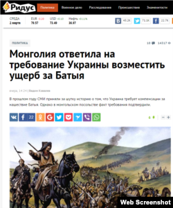 «Информация о том, что Украина требует от Монголии компенсацию за разрушение Киева войсками Батыя в XIII веке, которая появилась в медиапространстве в мае 2015 года, оказалась не шуткой. Монгольские дипломаты официально подтвердили: украинская власть требует компенсации за нашествие хана Батыя и разрушение Киева татаро-монголами», – рассказали во вторник «Вести.ру».
