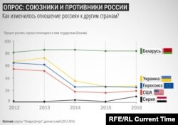 Лучше всего россияне относятся к Беларуси, Украине и Евросоюзу.