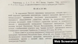 Но, говоря о завершении своей карьеры в Генпрокуратуре Украины, Наталья Поклонская умалчивает о важном факте – она не писала рапорт об увольнении, а была уволена за нарушение присяги украинского прокурора с лишением классного чина «советник юстиции». Крым.Реалии располагают копией соответствующего приказа за подписью и. о. Генпрокурора Украины Олега Махницкого.
