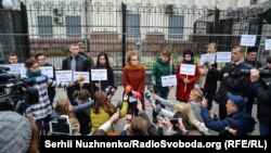 Заместитель координатора «Крым SOS» Евгения Андреюк объявляет о начале акции и ее обступают журналисты и телекамеры.