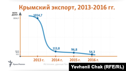 Сокращение экспорта начинается с 2014 года, хотя основные международные санкции против полуострова начали действовать только в 2015 году. В частности, в первый год российского контроля над Крымом общий объем экспорта полуострова составил $113,8 млн ($97,9 млн из Крыма и $15,9 млн из Севастополя), сократившись почти в 9 раз в сравнении с 2013 годом. В 2015 году вывоз товаров из Крыма сократился до $96,8 млн, а в 2016 – упал еще на 44%.