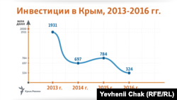 После прихода на полуостров российской власти индекс инвестирования резко пошел вниз. В 2014 году объем инвестиций в Крым снизился в 2,8 раза, по сравнению с предыдущим годом, и составил всего 26,5 млрд рублей ($697 млн). В 2015 году на полуострове отчитались о притоке средств в размере 47,6 млрд рублей, что по курсу 2015 года составило $784 млн. Таким образом, реальный прирост в сравнении с 2014 годом достиг $87 млн. Однако догнать, а тем более перегнать уровень 2013 года оказалось делом невозможным.