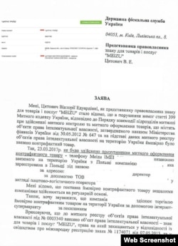 Также в публикации есть письмо, где сказано, что в марте на территорию Украины «был ввезен контрафактный товар» и таможня не остановила его оформление, как должна была сделать. Представитель ТМ призывает ДФС принять меры по этому поводу.