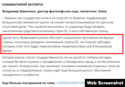 В материале «Дневник киевлянки: по случаю безвиза украинцы нарядились в вышиванки и собрались в Париж» на сайте «Комсомольской правды» говорится о том, что якобы те, кто посетят Евросоюз, не получат субсидии. Об этом якобы заявил доктор философских наук Владимир Шевченко.