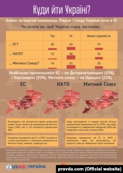 Зато сторонников Евросоюза в этих частях Украины больше ‒ 26%. А 14% жителей этих регионов хотели бы, чтобы Украина присоединилась к Таможенному союзу.