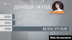 В декларациях Сергея Аксенова весь путь жены к безбедному существованию как на ладони. В 2014-м году за ней значится три миллиона рублей (1 290 тысяч гривен) заработка, в 2015-м – уже три с половиной миллиона (полтора миллиона гривен). А в прошлом 2016 году Елена Аксенова умножила свое состояние сразу в десять раз.