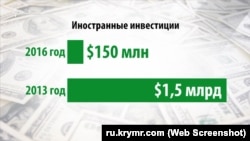 Иностранные вливания составили десятую часть прошлогоднего крымского бюджета – около 150 миллионов долларов. Для сравнения: в 2013 году иностранцы вложили в Крым более 1,5 миллиарда долларов.