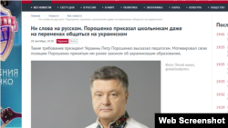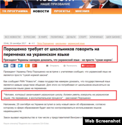 В конце сентября российские средства массовой информации сообщили в своих заголовках, что президент Украины Петр Порошенко якобы приказал украинским школьникам общаться на украинском языке даже во время школьных перемен. Однако полная цитата Порошенко об этом имеет совсем другой смысл: глава государства обратился с просьбой к учителям повышать престиж языка не только на уроках, но и в общении с детьми.