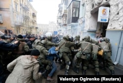 Как сообщает корреспондент Радіо Свобода, правоохранители пустили слезоточивый газ, автомобиль с Саакашвили начал медленно двигаться по Трехсвятительской в сторону Украинского дома. Но потом активисты спустили шины.