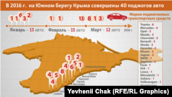 Еще один пример – поджог машины в Малом Маяке под Алуштой через полчаса после того, как один из подсудимых разговаривал по телефону и был «запеленгован» оператором в Алупке. Между этими населенными пунктами – около пятидесяти километров, преодолеть которые ночью по зимним горным дорогам за тридцать минут маловероятно. А ведь нужно еще время на подготовку и совершение преступления.