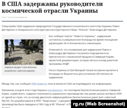 Российские и некоторые украинские СМИ сообщили о том, что в США якобы задержаны руководители космической отрасли Украины. При этом они сослались на «украинские СМИ» и «Новости Украины». Вероятно, речь идет о сайте from-ua.com, на котором уже удалили такую «новость», и пока страница доступна только в кэше.