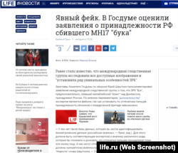 Так, например, сайт российского канала «Life» (бывший LifeNews) вышел с заголовком: «Явный фейк. В Госдуме оценили заявления о принадлежности РФ сбившего MH17 «бука».