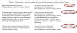 В 2017 году в детский центр направили 1,4 миллиарда рублей для проектирования и строительства концертно-эстрадного комплекса. А в 2018 году – 3,3 миллиарда рублей для финансирования работ по противооползневой и инженерной защите территории спальных корпусов и центра инновационных образовательных технологий детского лагеря «Солнечный». В течение пяти лет этот лагерь с уникальным образовательным комплексом на 1,5 тысячи мест и долгосрочными образовательными программами должен был стать «локомотивом» всех изменений, записанных в планах российских чиновников.