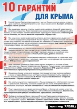Еще одну листовку под названием «Десять гарантий для Крыма», распространяли весной 2014 года от имени крымского парламента.