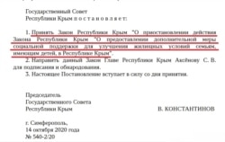 14 октября в российском парламенте Крыма приостановили действие этого закона до 2024 года. Решение депутаты принимали непублично, на заочном голосовании, поскольку ранее ушли на дистанционную работу из-за угрозы коронавируса.