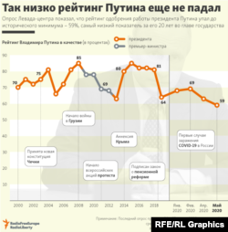 Директор "Левада-центра" Лев Гудков рассказал Радио Свобода, что одобрение и поддержка президента снижаются уже несколько лет, начиная примерно с августа 2018 года, когда он подписал законопроект о пенсионной реформе.