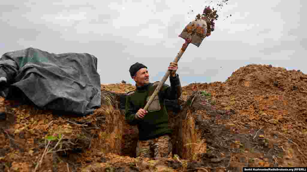 Украинский военный роет траншею на передней линии обороны Донецкой области, 18 апреля 2022 года