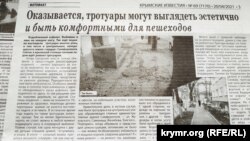 «Крымские известия» рассказывают о том, как ведется ремонт дорожного покрытия в Симферополе. «Вздыбленный асфальт. Выбоины и ямы на каждом шагу. Так еще недавно выглядели тротуары многих улиц, в том числе и центральных, находящихся в самом «сердце» Симферополя. Сейчас в крымской столице полным ходом идет ремонт тротуаров», – пишет газета. Издание отмечает, что ремонтные бригады аккуратно выполняют задание: чтобы тротуары были ровные, полностью покрытые асфальтом, рабочие сняли старые полотно и плитку, выпилили вздыбленные корни деревьев, сами растения аккуратно оградили бордюрами, такими же бордюрами выделили и клумбы. «Словом, тротуарная зона действительно стала комфортной и эстетичной. Выдержит ли асфальт наш климат? Скоро увидим. Но пока любо-дорого смотреть, а главное – ходить. Единственная ложка дегтя в этой бочке меда – отсутствие ливневок. Когда идет даже небольшой дождь, на тротуарах образуются лужи. Некомфортно», – пишет газета.