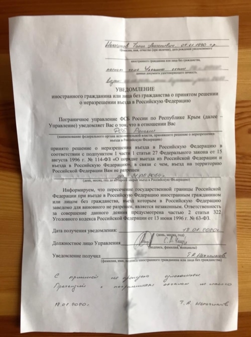 18 января 2020 года корреспонденту Крым.Реалии Тарасу Ибрагимову сообщили, что ему запрещен въезд на территорию России и аннексированного ею Крыма до конца мая 2054 года.