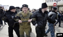 Возле здания крымского парламента «кубанские казаки» задержали двоих активисток FEMEN, которые протестовали против оккупации части Украины Россией.