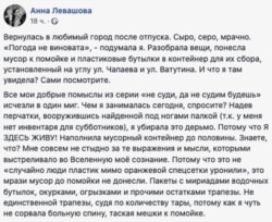 – В ситуации с уборкой мусора я поступила как адекватный и неравнодушный горожанин, а не как чиновник. Моя личная страница в соцсетях – это не административный ресурс, это не официальное СМИ, а моя личная страница, которую я веду более 13 лет (в мэрии я работаю 1 год и 3 месяца). Я была в отпуске, когда собирала мусор и писала пост, а не на работе. Я выразила свое частное мнение жителя родного города и конкретного двора, а не мнение администрации Петрозаводска. Я не крыла матом, а выражалась литературным языком Чехова и Грибоедова. Я же лишь не хочу, чтобы жители Петрозаводска утопали в грязи из-за тех, кто этот город превращает в помойку. А мусор, убранный мною, оставили именно такие персонажи, которым плевать на все и на всех. Стыдно быть равнодушным и молчаливым, я так считаю, – сказала чиновница.