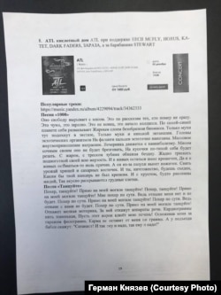 Радио Свобода публикует распечатки с текстами песен популярных молодежных исполнителей, которые раздали членам Экспертного совета при Управлении Федеральной антимонопольной службы России в Нижнем Новгороде – для того, чтобы обсудить необходимость превентивного запрета их концертов.