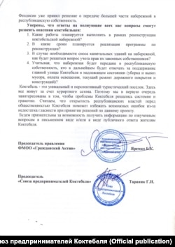 «Общественность и предприниматели нашего поселка пока не получили почти никакой официальной информации о подробностях предстоящей реконструкции. Из-за отсутствия исчерпывающей достоверной информации, среди предпринимателей Коктебеля начинают курсировать слухи о якобы предстоящем сносе всех капитальных строений на набережной», – говорится в сообщении.