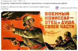 Конечно, власть не стала искать причину этих противоречий в конфликте между естественным правом человека быть свободным и усиливающимися притеснениями этого права со стороны тоталитарного государства. Для чиновников в такой ситуации, как оказалось, есть только один выход – усиление подавляющих человека силы и всевластия государства. В Севастополе приняты законодательные решения и уже объявлен набор кандидатов на новую должность – советник директора школы по воспитанию. «Это будет отдельная ставка – советники директора школы по воспитательной работе. Подобная практика была в советское время», – приводятся на сайте слова губернатора Михаила Развожаева. Сайт городских новостей ForPost разгадал тайный замысел власти и прямо назвал новые кадры «замполитами» по воспитательной работе, а горожане в комментариях называют будущих «военруков», как они назывались в советской школе, «комиссарами».