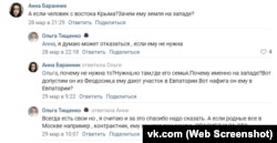 «Вот почему именно крымчанам? Там ребята воюют за Россию со всех уголков Родины. Может, паренёк из Сибири мечтает о семье и своей земле, там, в Крыму. Чем он хуже паренька из Крыма?» – пишет Наталья Любимая (Суходеева).