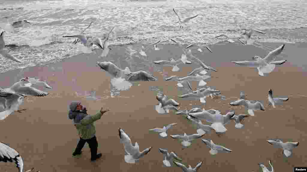 На фото: мужчина кормит чаек у берегов холодного Черного моря в Евпатории.