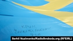 В Киеве активисты развернули под зданием Верховной Рады флаг крымскотатарского народа, на котором все желающие, в частности депутаты и их помощники оставили свои пожелания для жителей Крыма, сообщает корреспондент Крым.Реалии.