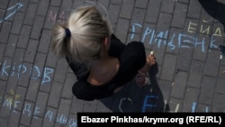 Участники акции нарисовали на асфальте карту Крыма, в центре написали «Сенцов», а вокруг него имена других политических заключенных, удерживаемых в России.