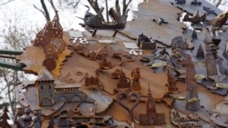 В Симферополе железная карта России с «прикованным» Крымом поржавела. Как сообщает корреспондент Крым.Реалии, ржавчина почти покрыла отдельные листовые сегменты карты со стилизованными достопримечательностями российских регионов, в частности Москвы, Тверской, Новгородской, Саратовской областей.