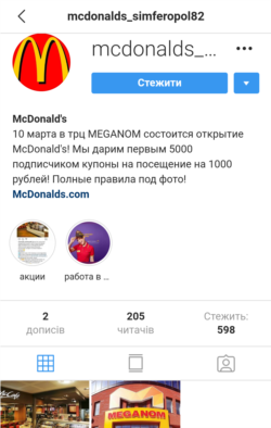 Ранее в соцсети Instagram была зарегистрирована страница mcdonalds_simferopol82, на которой анонсировалось открытие 10 марта ресторана McDonald's в одном из торговых центров Симферополя.