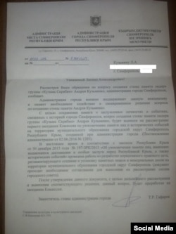 Об этом говорится в соответствующем ответе, подписанном замглавы администрации Тейфуком Гафаровым на письмо Кузьмина, которое активист опубликовал в социальных сетях.